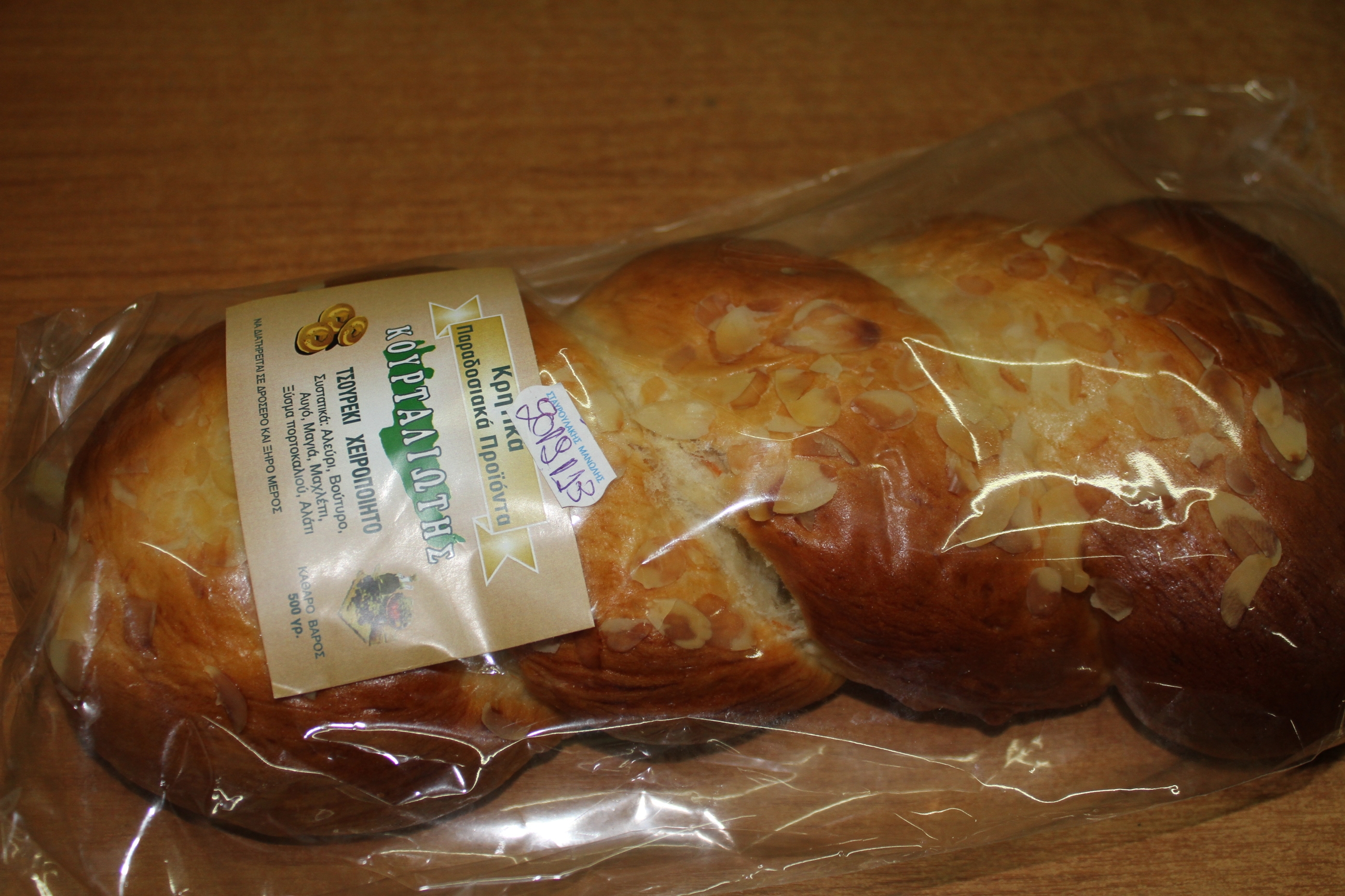Ένα καταπληκτικό χειροποίητο τσουρέκι,χωρίς συντηρητικά,με γεύση μοναδική!Ένα υπέροχο μείγμα από αλεύρι,βούτυρο,αυγό,μαγιά,μαχλέπι,ξύσμα πορτοκαλιού και αλάτι.Μια αυθεντική γεύση,κατάλληλη για πρωινό,για το γάλα σας,τρομερό μέσα στον καφέ αλλά και για όλες τις ώρες της ημέρας.Η καλύτερη και νοστιμότερη επιλογή για τα μικρά παιδιά τα οποία θα το λατρέψουν!Φρέσκο,παραλαμβάνεται τρεις φορές την εβδομάδα σε συσκευασία 500gr.Από τον “Κουρταλιώτη”.